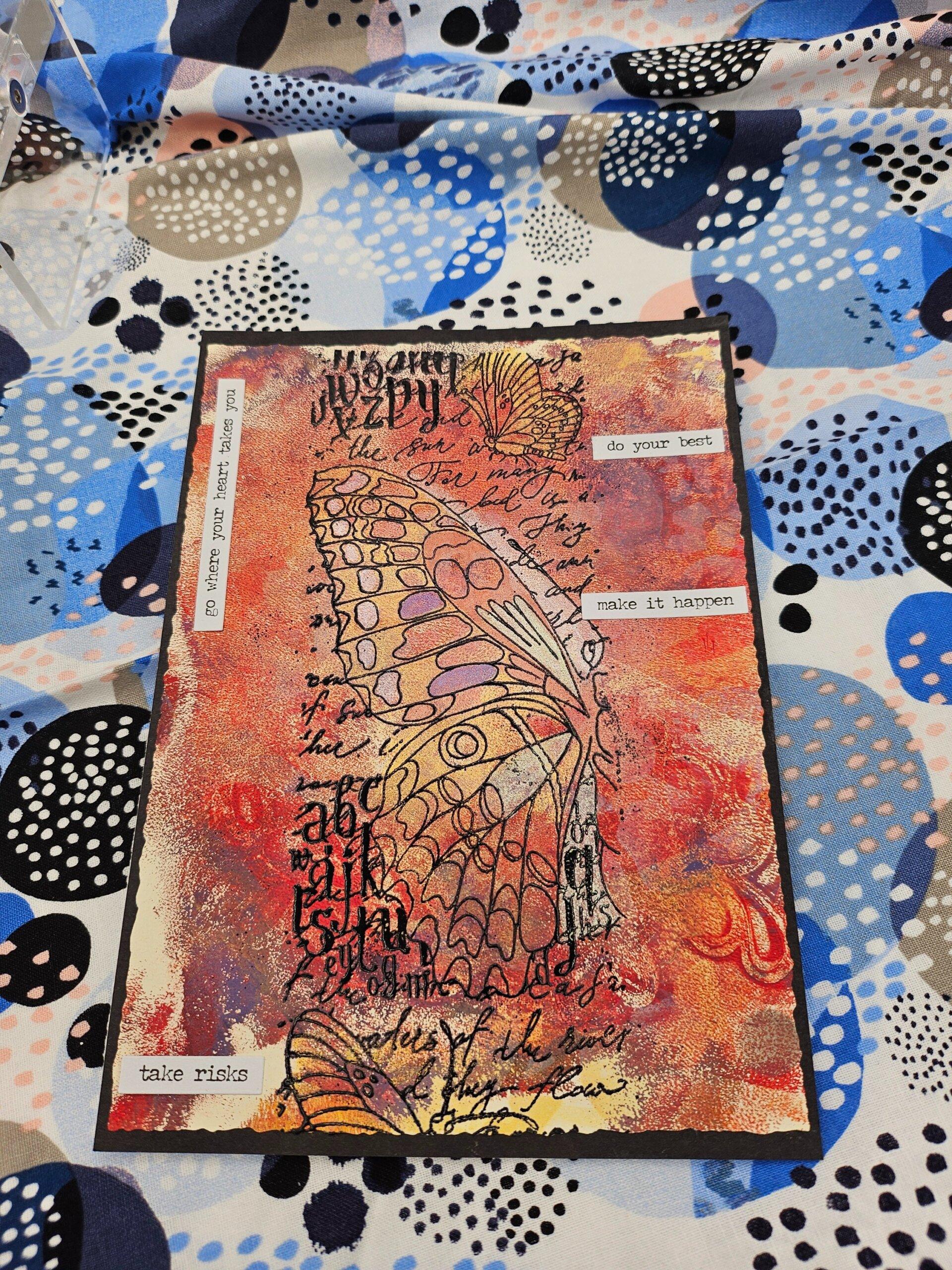 This vibrant and colorful card features a beautiful butterfly and other intricate designs that are sure to bring a smile to the recipient’s face.
