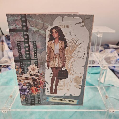 Celebrate success with our handmade, unique congratulations greeting card from FSGDesigns. This exquisite card features a captivating design of a lady and a camera, brought to life with vibrant artistic colors. Perfectly embodying our passion and inspiration, it’s an ideal way to show your loved ones how proud you are of their achievements. Each card is meticulously crafted to ensure it becomes a cherished keepsake. Make every congratulations moment truly special with this one-of-a-kind creation. 5×7 card with envelope.