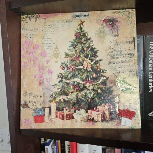 Capture the warmth and wonder of the holidays with this nostalgic Christmas tree art from FSG Designs. Layered with antique sheet music, glowing candles, timeless ornaments, and beautifully wrapped presents, this 12×12 canvas radiates cozy vintage charm. Delicate accents like bells, birds, florals, and lace textures make this piece both soulful and celebratory.