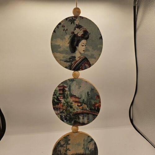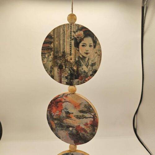 Introducing FSGDesigns’ Japanese Artistic Swinging’ Decor! These colorful, handmade, decoupaged wooden circular door hangers capture the essence of Japanese art with intricate features of artistic faces, historical buildings, and mesmerizing landscapes. Each two-sided piece measures 4.5×4.5 inches and the entire decor stretches a captivating 30 inches long. Perfect for hanging on doors or suspending from the ceiling, these unique decorations will breathe life and style into any room of your home. Let FSGDesigns bring passion and inspiration into your space with our exquisite handcrafted creations! Makes unique one-of-a-kind gifts for friends and family.