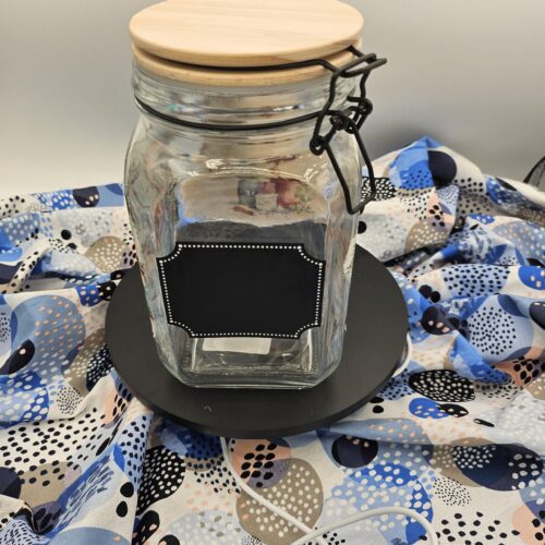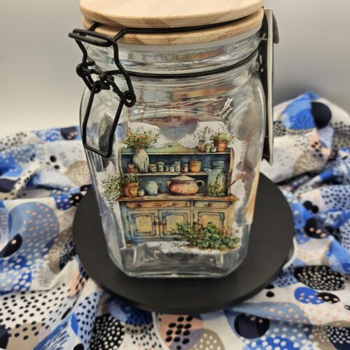 Add a touch of charming elegance to any room with FSGDesigns’ handcrafted Kitchen Themed Decorated Storage Jar! This 4″ wide by 7″ high glass jar is adorned with beautiful rice paper designs that highlight delightful kitchen elements, making it a versatile piece that fits seamlessly into your kitchen, bedroom, or bathroom. Ideal for storing tea leaves, coffee beans, small toiletries, or even keepsakes, this jar marries functionality with artful decor. Front of jar has a small chalk board for labeling your items.  A thoughtful gift for loved ones, it’s perfect for anyone who appreciates handmade items that blend passion and inspiration effortlessly. Elevate your everyday storage while adding sophistication to your home with this unique FSGDesigns offering.
